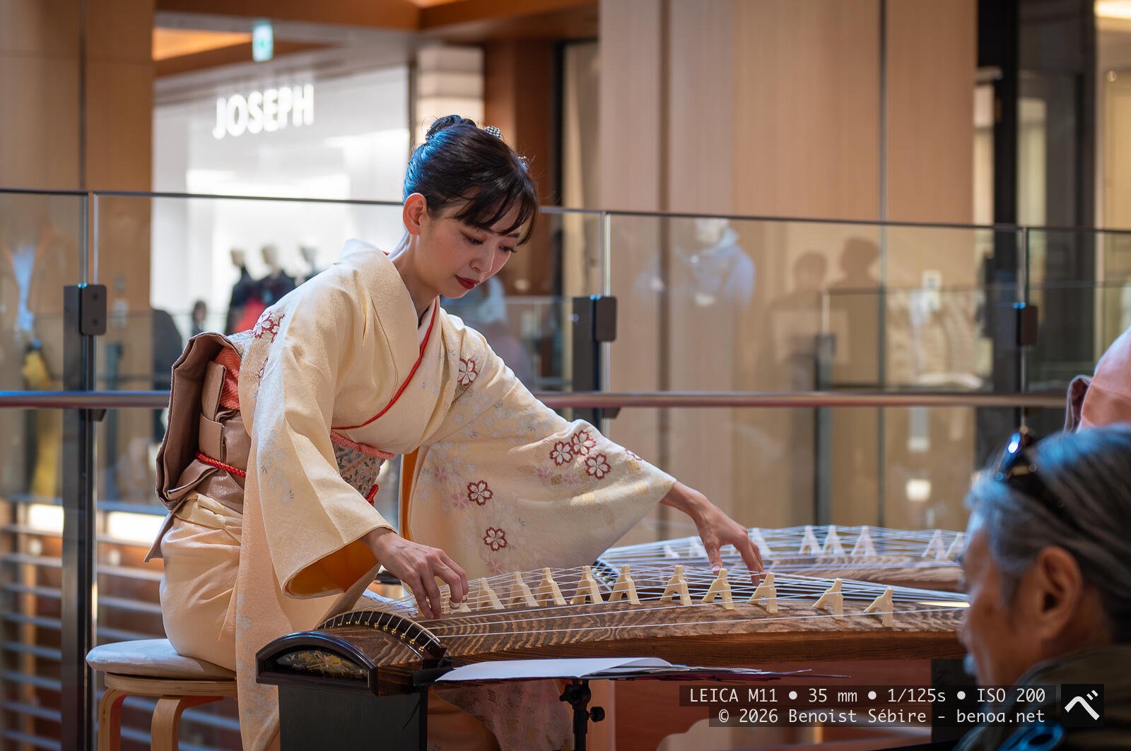 Koto demonstration for the new year in Tokyo Midtown. The koto is a traditional Japanese string instrument with a long, elegant wooden body that looks slightly like a boat that decided to become musical. It usually has thirteen strings stretched over movable bridges, which players shift carefully before performing. This simple detail allows endless variations in tuning, a small act of preparation that feels half ritual, half puzzle.